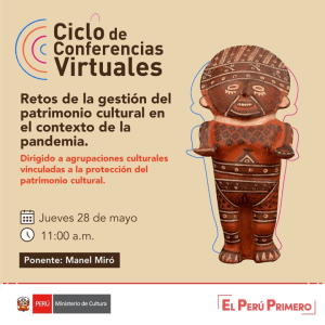 Publico hoy el vídeo de la conferencia on line «Retos de la gestión del patrimonio cultural en el contexto de la pandemia», que impartí el pasado 28 de mayo de 2020 invitado por la Dirección General de Defensa del Patrimonio Cultural del Ministerio de Cultura de Perú, en el marco del Ciclo de Conferencias Virtuales «Gestión del Patrimonio e Innovación en tiempos del Covid – 19».